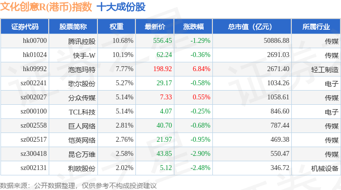 文化创意R(港币)(480047)指数十大成份股详情如下: