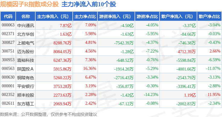 资金流向方面,规模因子R(480055)指数成份股当日主力资金净流入合计6.41亿元,游资资金净流出合计9.96亿元,散户资金净流入合计3.55亿元。成份股资金流向详情见下表: