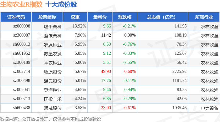 资金流向方面,生物农业R(480072)指数成份股当日主力资金净流出合计1.26亿元,游资资金净流出合计7254.12万元,散户资金净流入合计1.59亿元。成份股资金流向详情见下表: