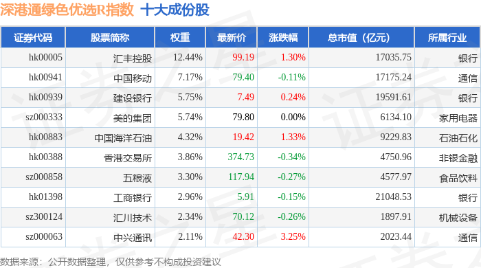 深港通绿色优选R(483011)指数十大成份股详情如下: