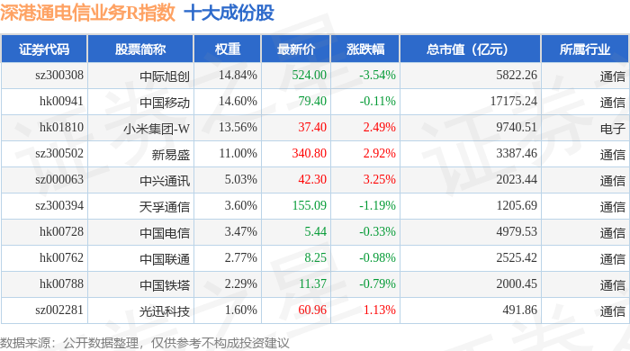 深港通电信业务R(483029)指数十大成份股详情如下: