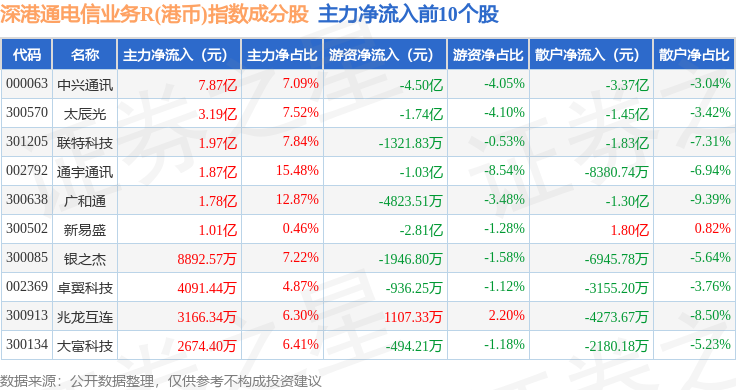 资金流向方面,深港通电信业务R(港币)(483030)指数成份股当日主力资金净流出合计13.7亿元,游资资金净流入合计7.38亿元,散户资金净流入合计6.33亿元。成份股资金流向详情见下表: