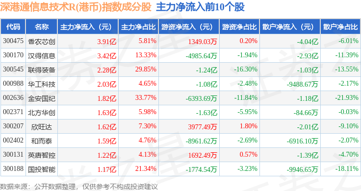 资金流向方面,深港通信息技术R(港币)(483028)指数成份股当日主力资金净流出合计51.28亿元,游资资金净流入合计1.0亿元,散户资金净流入合计50.28亿元。成份股资金流向详情见下表: