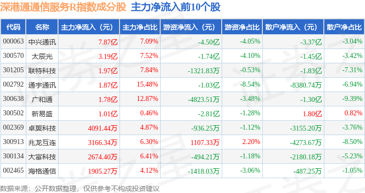资金流向方面,深港通通信服务R(483033)指数成份股当日主力资金净流出合计13.78亿元,游资资金净流入合计7.34亿元,散户资金净流入合计6.44亿元。成份股资金流向详情见下表: