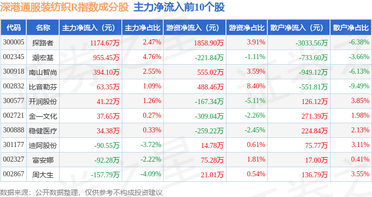 资金流向方面,深港通服装纺织R(483041)指数成份股当日主力资金净流出合计1.36亿元,游资资金净流入合计3949.75万元,散户资金净流入合计9661.16万元。成份股资金流向详情见下表: