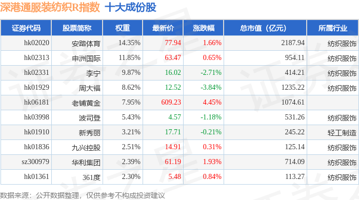 深港通服装纺织R(483041)指数十大成份股详情如下: