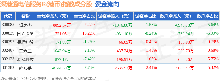 资金流向方面,深港通电信服务R(港币)(483058)指数成份股当日主力资金净流入合计776.24万元,游资资金净流入合计358.23万元,散户资金净流出合计1134.46万元。成份股资金流向详情见下表: