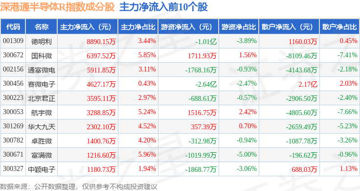 资金流向方面,深港通半导体R(483067)指数成份股当日主力资金净流入合计2.56亿元,游资资金净流出合计1.86亿元,散户资金净流出合计6939.03万元。成份股资金流向详情见下表: