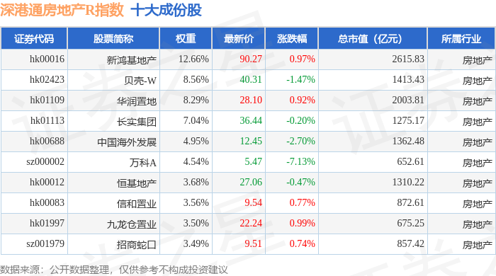证券之星消息,11月27日,深港通房地产R(483071)指数报收于3447.22点,跌0.47%,成交133.42亿元,换手率1.04%。当日该指数成份股中,上涨的有21家,上海实业控股以2.42%的涨幅领涨,下跌的有47家,万科企业以7.73%的跌幅领跌。