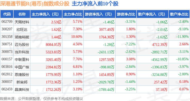 资金流向方面,深港通节能R(港币)(483086)指数成份股当日主力资金净流出合计13.35亿元,游资资金净流入合计3.0亿元,散户资金净流入合计10.35亿元。成份股资金流向详情见下表:
