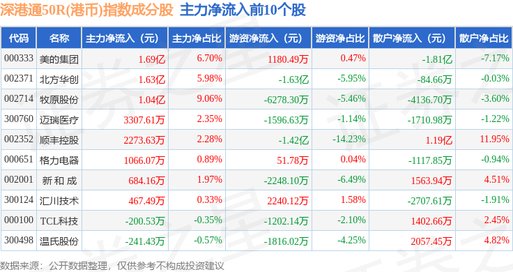 资金流向方面,深港通50R(港币)(483092)指数成份股当日主力资金净流出合计30.6亿元,游资资金净流入合计16.9亿元,散户资金净流入合计13.7亿元。成份股资金流向详情见下表: