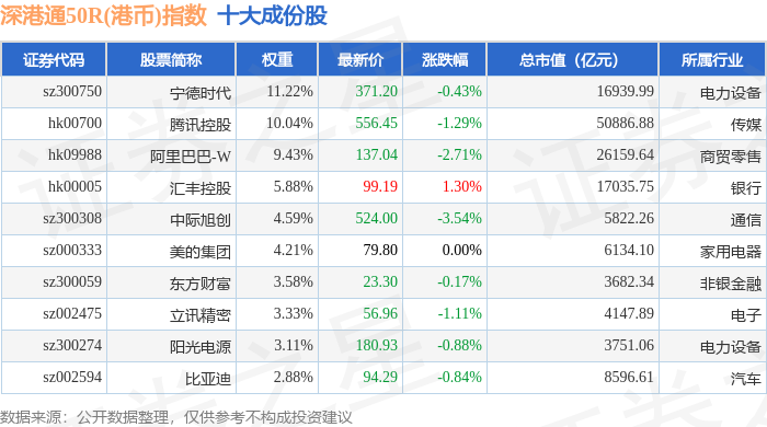 深港通50R(港币)(483092)指数十大成份股详情如下: