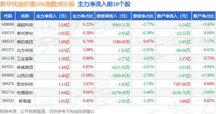 资金流向方面,新华优选价值50R(489004)指数成份股当日主力资金净流出合计31.54亿元,游资资金净流入合计16.26亿元,散户资金净流入合计15.28亿元。成份股资金流向详情见下表: