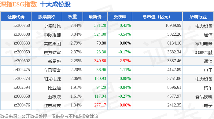 证券之星消息,11月27日,深指ESG(970026)指数报收于13701.06点,跌0.28%,成交3912.97亿元,换手率1.4%。当日该指数成份股中,上涨的有153家,赛微电子以15.18%的涨幅领涨,下跌的有227家,石基信息以9.98%的跌幅领跌。