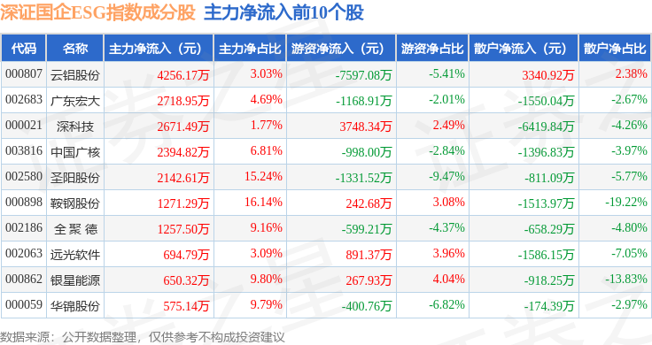 资金流向方面,深证国企ESG(970055)指数成份股当日主力资金净流出合计10.88亿元,游资资金净流入合计2.76亿元,散户资金净流入合计8.12亿元。成份股资金流向详情见下表: