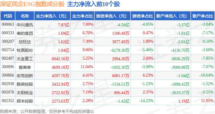 资金流向方面,深证民企ESG(970056)指数成份股当日主力资金净流出合计9.03亿元,游资资金净流入合计5897.03万元,散户资金净流入合计8.44亿元。成份股资金流向详情见下表: