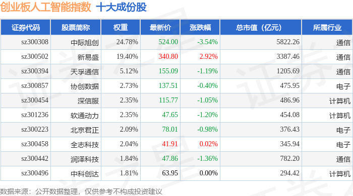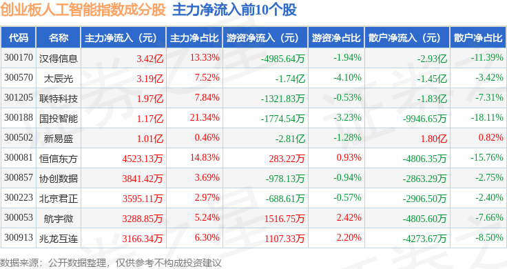 资金流向方面,创业板人工智能(970070)指数成份股当日主力资金净流出合计38.84亿元,游资资金净流入合计16.28亿元,散户资金净流入合计22.56亿元。成份股资金流向详情见下表:
