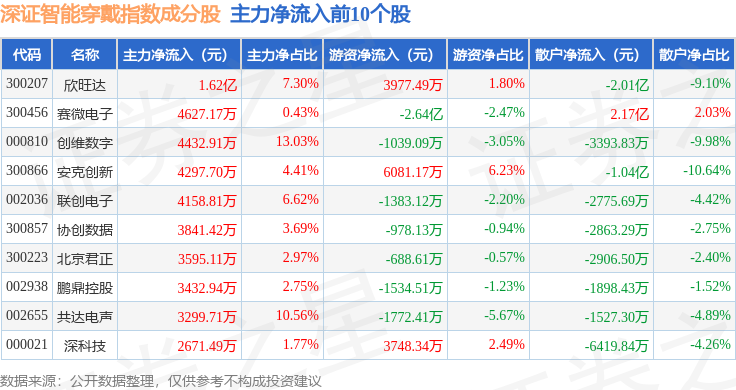 资金流向方面,深证智能穿戴(970074)指数成份股当日主力资金净流出合计7.32亿元,游资资金净流出合计2.76亿元,散户资金净流入合计10.07亿元。成份股资金流向详情见下表: