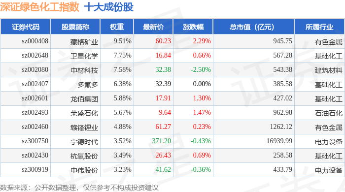 证券之星消息,11月27日,深证绿色化工(970076)指数报收于1591.0点,涨0.52%,成交357.34亿元,换手率1.83%。当日该指数成份股中,上涨的有28家,东岳硅材以8.01%的涨幅领涨,下跌的有18家,京新药业以5.97%的跌幅领跌。