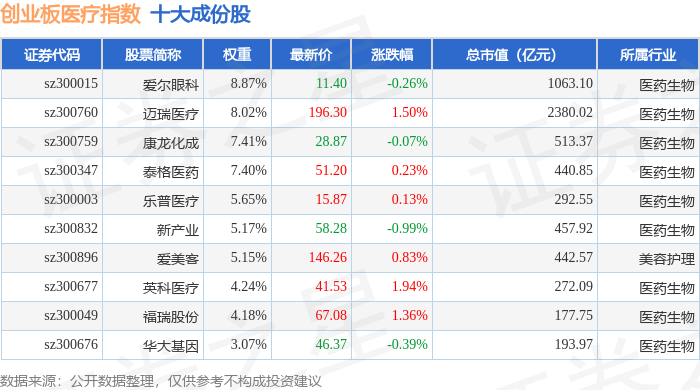 证券之星消息,11月27日,创业板医疗(970082)指数报收于3661.9点,涨0.18%,成交85.16亿元,换手率1.15%。当日该指数成份股中,上涨的有27家,乐心医疗以2.04%的涨幅领涨,下跌的有22家,迪安诊断以2.96%的跌幅领跌。