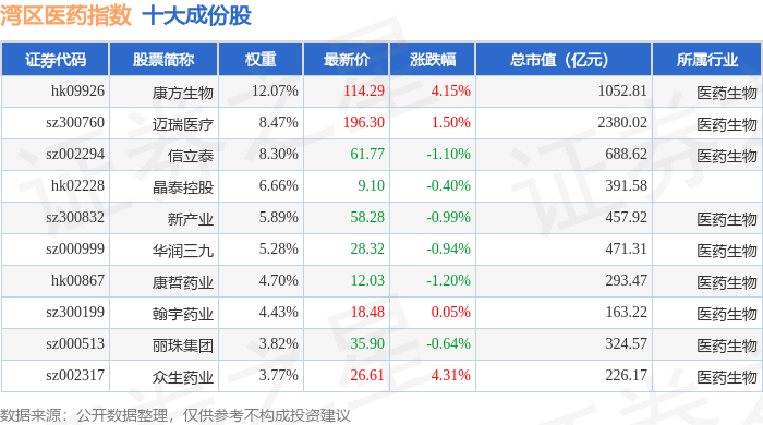 资金流向方面,湾区医药(980013)指数成份股当日主力资金净流入合计2.46亿元,游资资金净流出合计1.33亿元,散户资金净流出合计1.13亿元。成份股资金流向详情见下表: