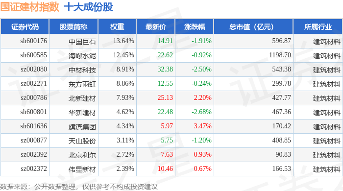 国证建材(980048)指数十大成份股详情如下: