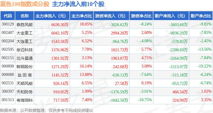 资金流向方面,蓝色100(980068)指数成份股当日主力资金净流出合计7.61亿元,游资资金净流入合计2976.83万元,散户资金净流入合计7.32亿元。成份股资金流向详情见下表: