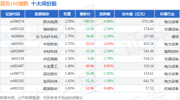 证券之星消息,11月27日,蓝色100(980068)指数报收于3496.6点,跌0.3%,成交359.13亿元,换手率0.83%。当日该指数成份股中,上涨的有43家,泰胜风能以4.51%的涨幅领涨,下跌的有51家,中集集团以4.71%的跌幅领跌。