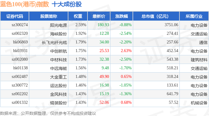 蓝色100(港币)(980069)指数十大成份股详情如下: