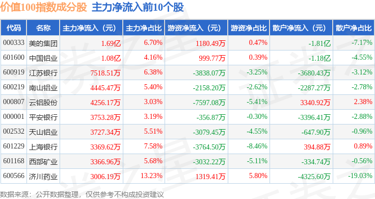 资金流向方面,价值100(980081)指数成份股当日主力资金净流出合计1.78亿元,游资资金净流入合计3.13亿元,散户资金净流出合计1.56亿元。成份股资金流向详情见下表: