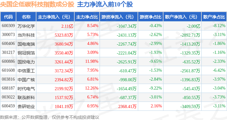 资金流向方面,央国企低碳科技(980082)指数成份股当日主力资金净流出合计7.06亿元,游资资金净流入合计2.54亿元,散户资金净流入合计4.52亿元。成份股资金流向详情见下表: