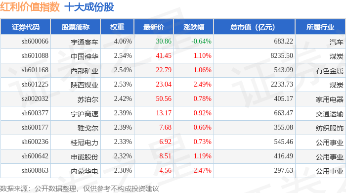 证券之星消息,11月27日,红利价值(980103)指数报收于3206.34点,涨0.32%,成交220.28亿元,换手率0.32%。当日该指数成份股中,上涨的有27家,陕西煤业以2.49%的涨幅领涨,下跌的有16家,建发股份以1.69%的跌幅领跌。