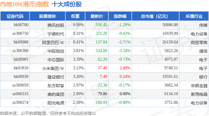 内地100(港币)(983002)指数十大成份股详情如下: