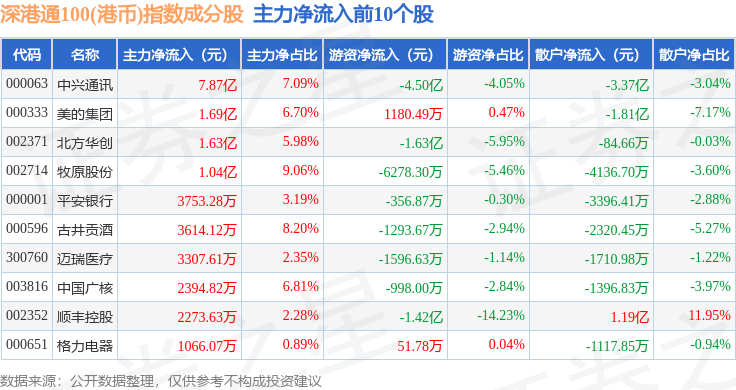 资金流向方面,深港通100(港币)(983008)指数成份股当日主力资金净流出合计33.3亿元,游资资金净流入合计16.17亿元,散户资金净流入合计17.13亿元。成份股资金流向详情见下表: