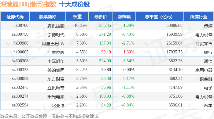深港通100(港币)(983008)指数十大成份股详情如下: