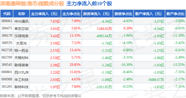 资金流向方面,深港通综指(港币)(983006)指数成份股当日主力资金净流出合计169.53亿元,游资资金净流入合计6.44亿元,散户资金净流入合计163.09亿元。成份股资金流向详情见下表: