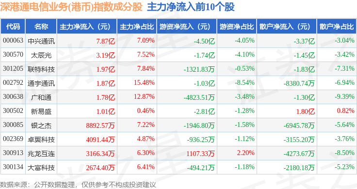 资金流向方面,深港通电信业务(港币)(983030)指数成份股当日主力资金净流出合计13.7亿元,游资资金净流入合计7.38亿元,散户资金净流入合计6.33亿元。成份股资金流向详情见下表: