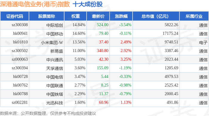 深港通电信业务(港币)(983030)指数十大成份股详情如下: