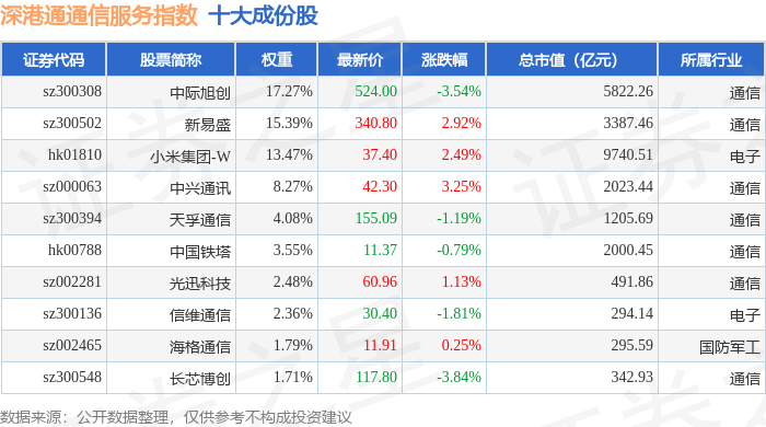 证券之星消息,11月27日,深港通通信服务(983033)指数报收于11446.55点,涨0.78%,成交1134.13亿元,换手率3.1%。当日该指数成份股中,上涨的有38家,通宇通讯以10.03%的涨幅领涨,下跌的有24家,长芯博创以3.84%的跌幅领跌。