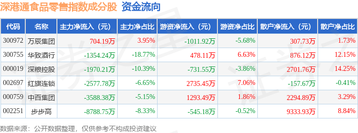 资金流向方面,深港通食品零售(983037)指数成份股当日主力资金净流出合计1.76亿元,游资资金净流入合计2218.4万元,散户资金净流入合计1.54亿元。成份股资金流向详情见下表: