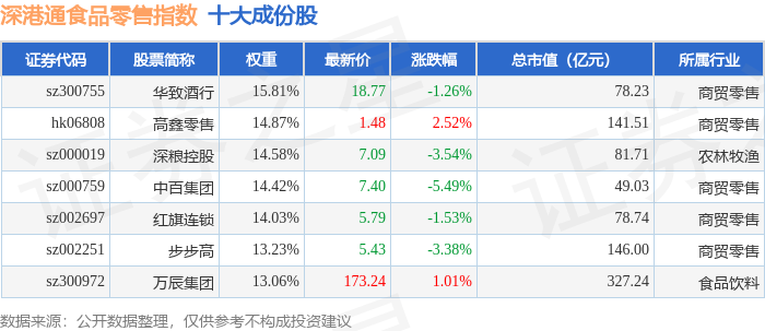 证券之星消息,11月27日,深港通食品零售(983037)指数报收于2315.64点,跌1.74%,成交26.06亿元,换手率2.75%。当日该指数成份股中,上涨的有2家,高鑫零售以2.52%的涨幅领涨,下跌的有5家,中百集团以5.49%的跌幅领跌。