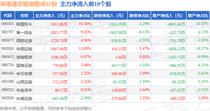 资金流向方面,深港通非银(983053)指数成份股当日主力资金净流出合计2.79亿元,游资资金净流出合计1106.81万元,散户资金净流入合计2.9亿元。成份股资金流向详情见下表: