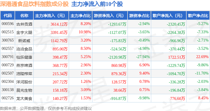 资金流向方面,深港通食品饮料(983065)指数成份股当日主力资金净流出合计1.46亿元,游资资金净流入合计1.32亿元,散户资金净流入合计1381.47万元。成份股资金流向详情见下表: