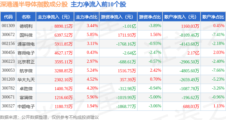资金流向方面,深港通半导体(983067)指数成份股当日主力资金净流入合计2.56亿元,游资资金净流出合计1.86亿元,散户资金净流出合计6939.03万元。成份股资金流向详情见下表:
