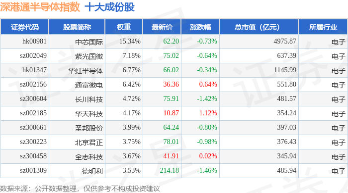 证券之星消息,11月27日,深港通半导体(983067)指数报收于13416.09点,涨0.37%,成交366.15亿元,换手率3.09%。当日该指数成份股中,上涨的有21家,赛微电子以15.18%的涨幅领涨,下跌的有17家,矽电股份以4.13%的跌幅领跌。