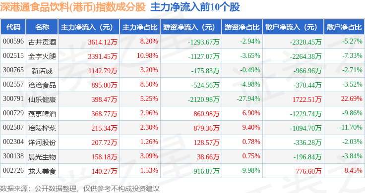 资金流向方面,深港通食品饮料(港币)(983066)指数成份股当日主力资金净流出合计1.46亿元,游资资金净流入合计1.32亿元,散户资金净流入合计1381.47万元。成份股资金流向详情见下表: