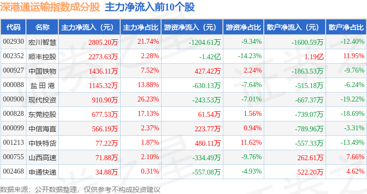 资金流向方面,深港通运输(983077)指数成份股当日主力资金净流出合计1.78亿元,游资资金净流出合计8732.41万元,散户资金净流入合计2.65亿元。成份股资金流向详情见下表: