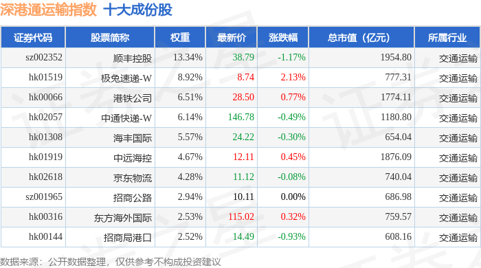 证券之星消息,11月27日,深港通运输(983077)指数报收于4338.94点,跌0.17%,成交59.63亿元,换手率0.4%。当日该指数成份股中,上涨的有19家,极兔速递-W以2.13%的涨幅领涨,下跌的有30家,海南高速以3.1%的跌幅领跌。