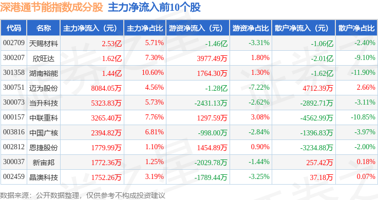 资金流向方面,深港通节能(983085)指数成份股当日主力资金净流出合计13.35亿元,游资资金净流入合计3.0亿元,散户资金净流入合计10.35亿元。成份股资金流向详情见下表: