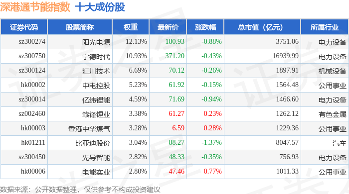 证券之星消息,11月27日,深港通节能(983085)指数报收于2259.95点,跌0.1%,成交709.45亿元,换手率0.81%。当日该指数成份股中,上涨的有24家,迈为股份以6.76%的涨幅领涨,下跌的有25家,中环新能源以2.96%的跌幅领跌。